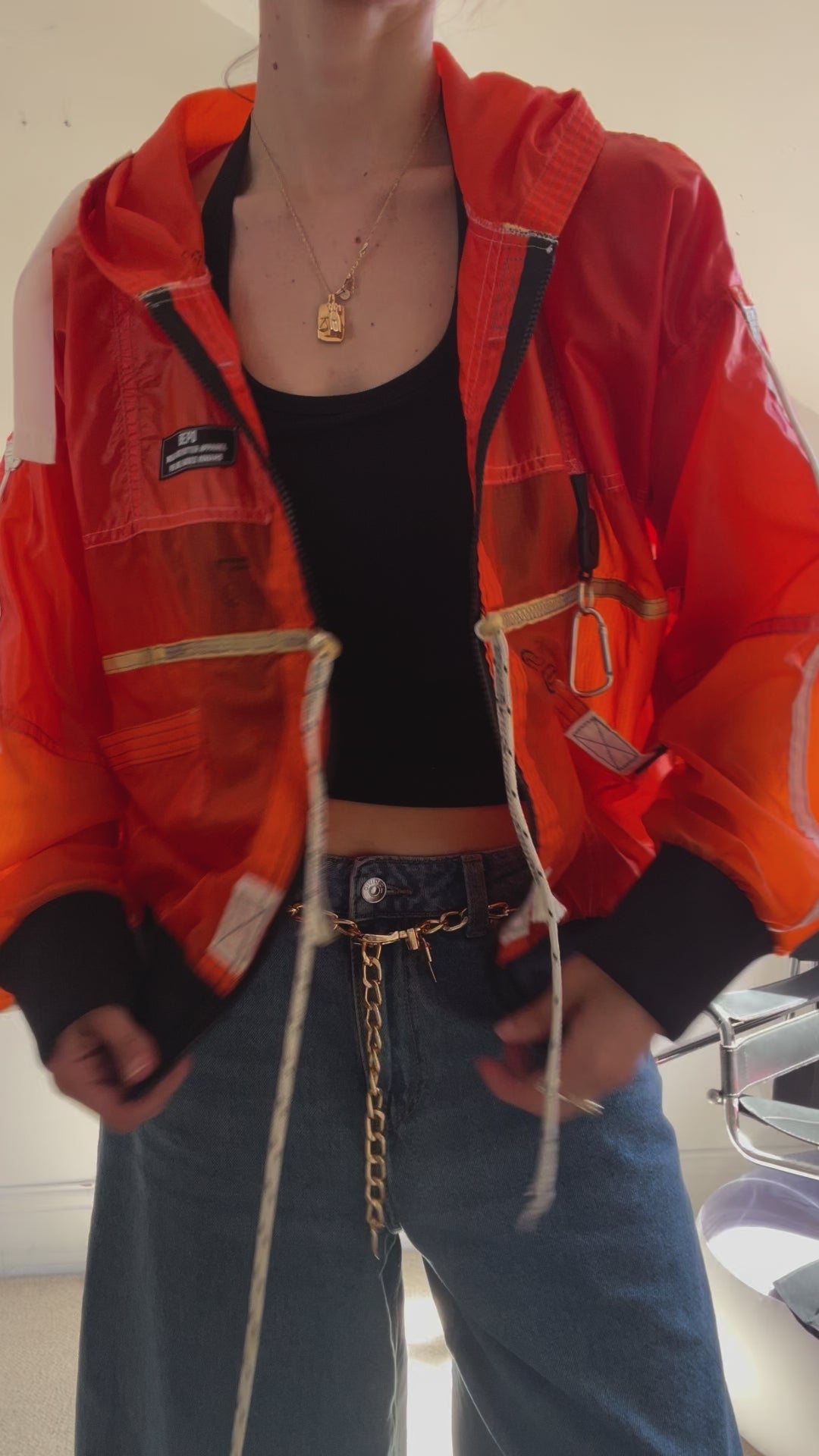 The TDS x BEPO Orange Jacket is a standout piece made from vibrant orange recycled parachute and edged in sleek black scuba. Wear it long or rouched up into a bomber-style fit. With a hood, pockets, clips, textured rope, and loads of cool technical details, it’s lightweight, versatile, and made for summer adventures and festival season.